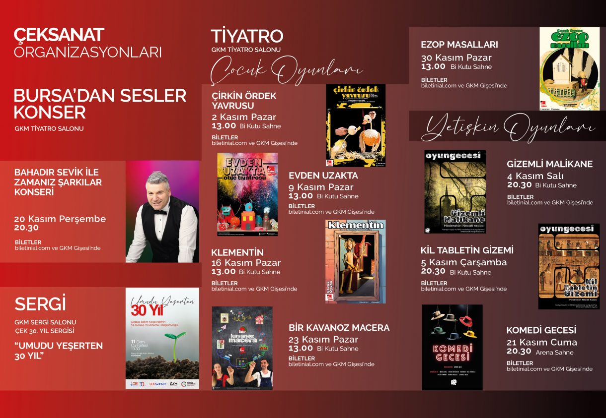 Kasım ayında konser, tiyatro, söyleşi, sergi ve birbirinden farklı etkinlikler ÇEKSANAT Görükle Kültür Merkezi'nde sizleri bekliyor!